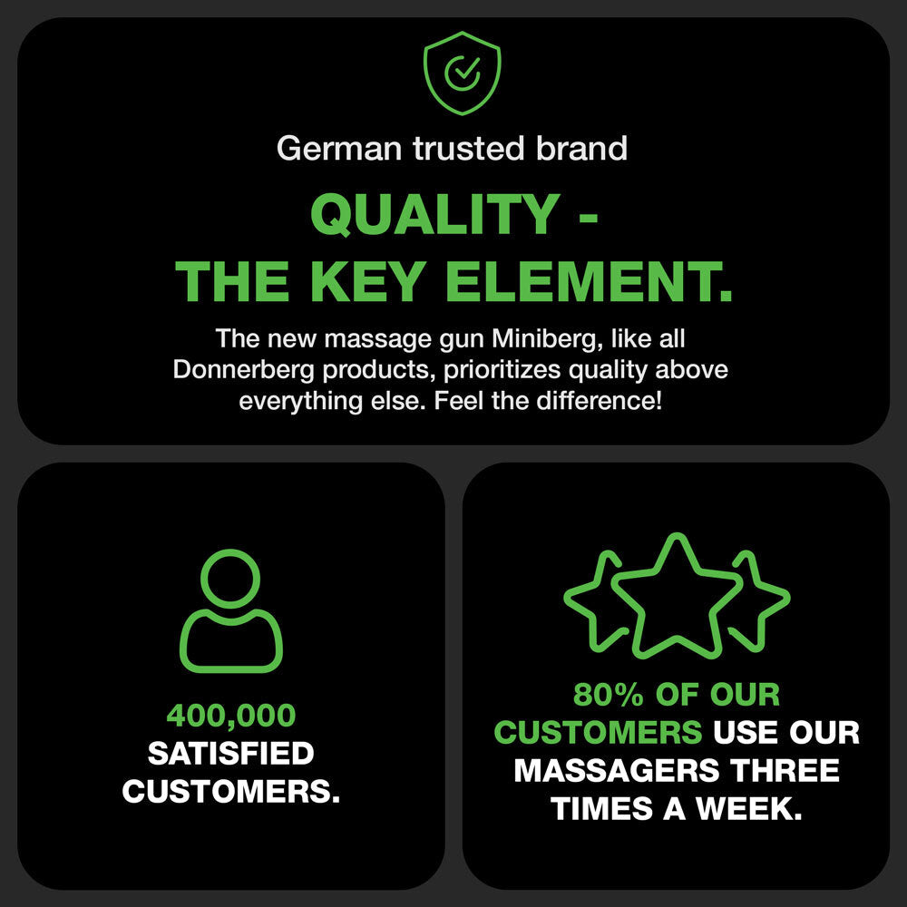 The Miniberg massage gun is a unique combination of high performance, user-friendliness, and durability in one device. Its powerful yet quiet brushless motor and long-lasting Samsung battery allow for targeted massages on all muscle groups. Equipped with 6 silicone attachments,, 8 speed levels, and a sturdy housing, it ensures an unparalleled massage experience.