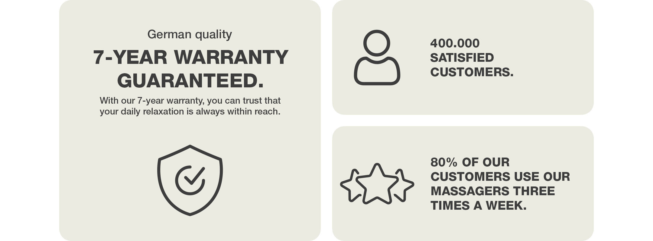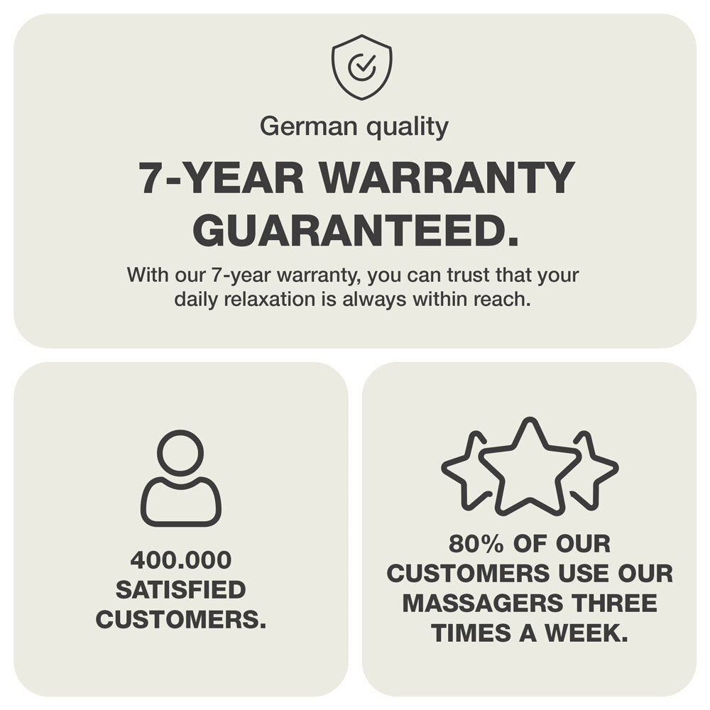 We stand behind the quality of our neck massager, which is why we provide a remarkable 7-year warranty. Rest assured, the powerful motor will exceed your expectations, while the rechargeable and durable Samsung battery, with over 800 charging cycles, will never let you down.
