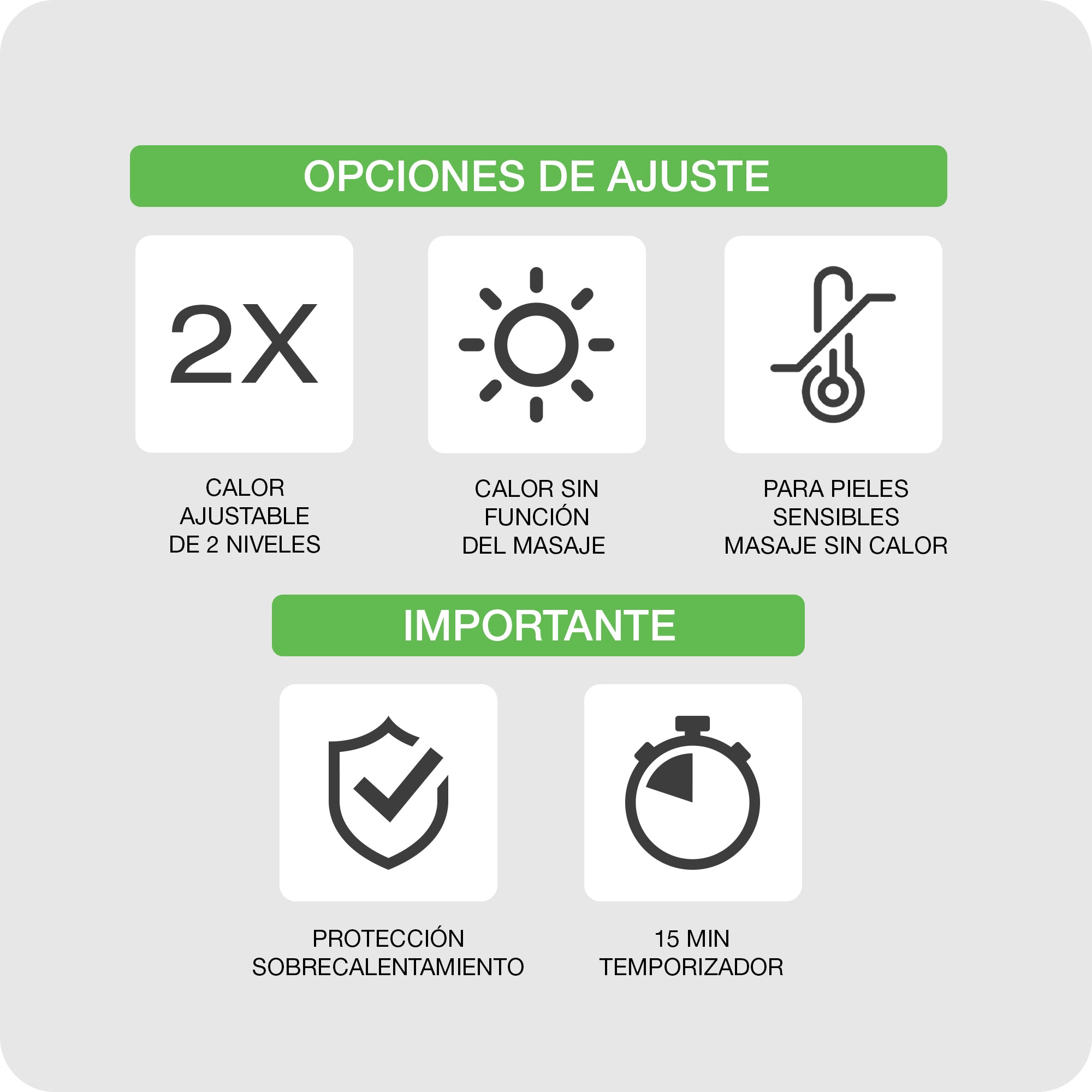 Dos niveles de calor infrarrojo te permiten establecer la temperatura ideal para tus necesidades. Si el dispositivo se calienta demasiado, la protección contra sobrecalentamiento se apagará.