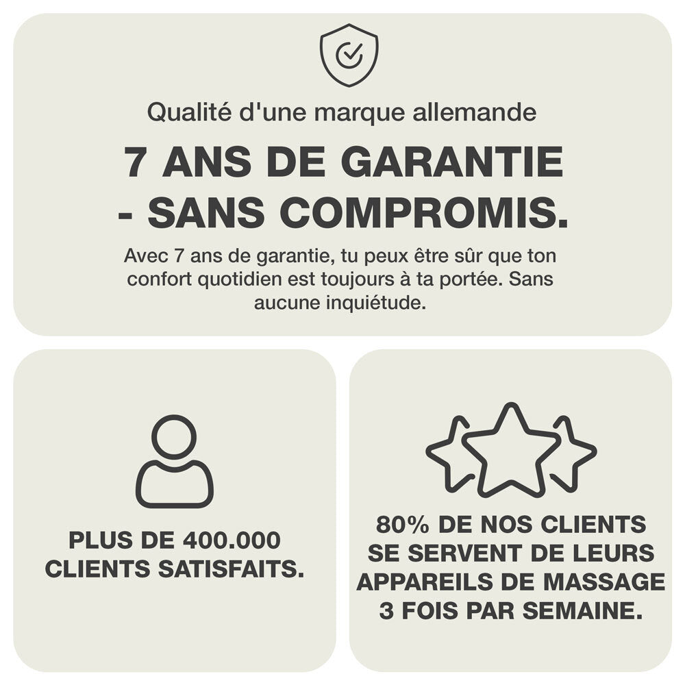 Le principe de fermeture zip breveté te permet d'enlever complètement la housse qui recouvre les têtes de massage et de la laver facilement dans la machine à laver à 30°C. Deux autres housses sont comprises dans le paquet. Ainsi, l'appareil reste toujours bien propre et plusieurs personnes peuvent l'utiliser en même temps.