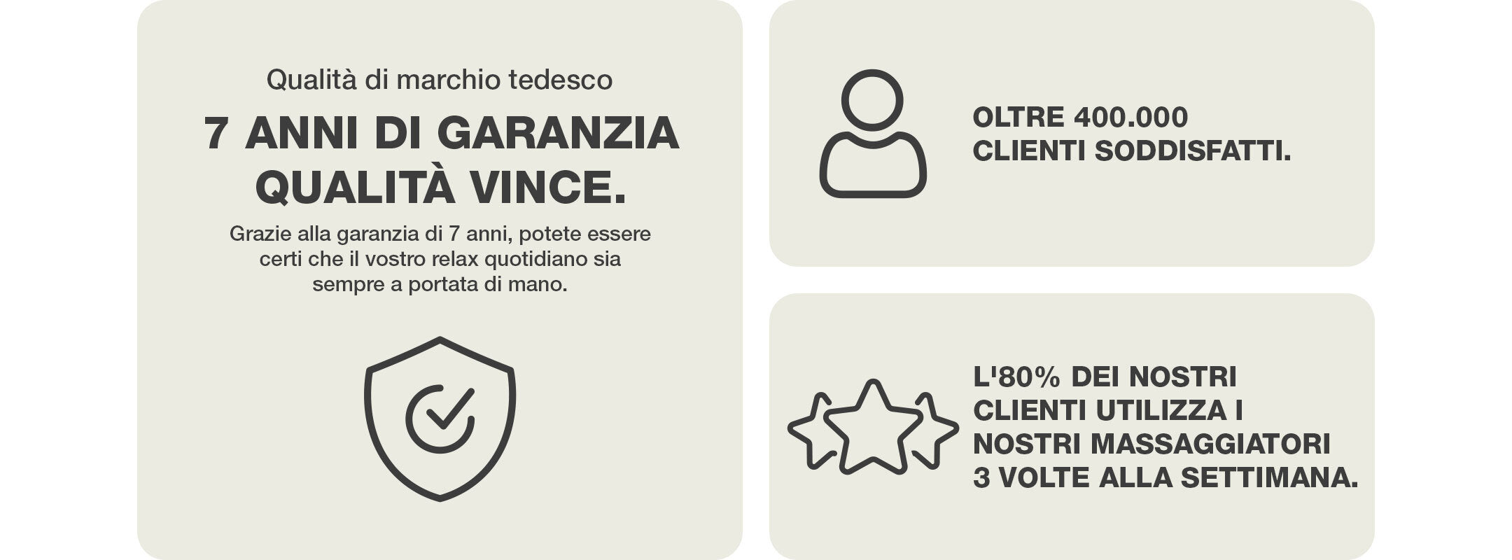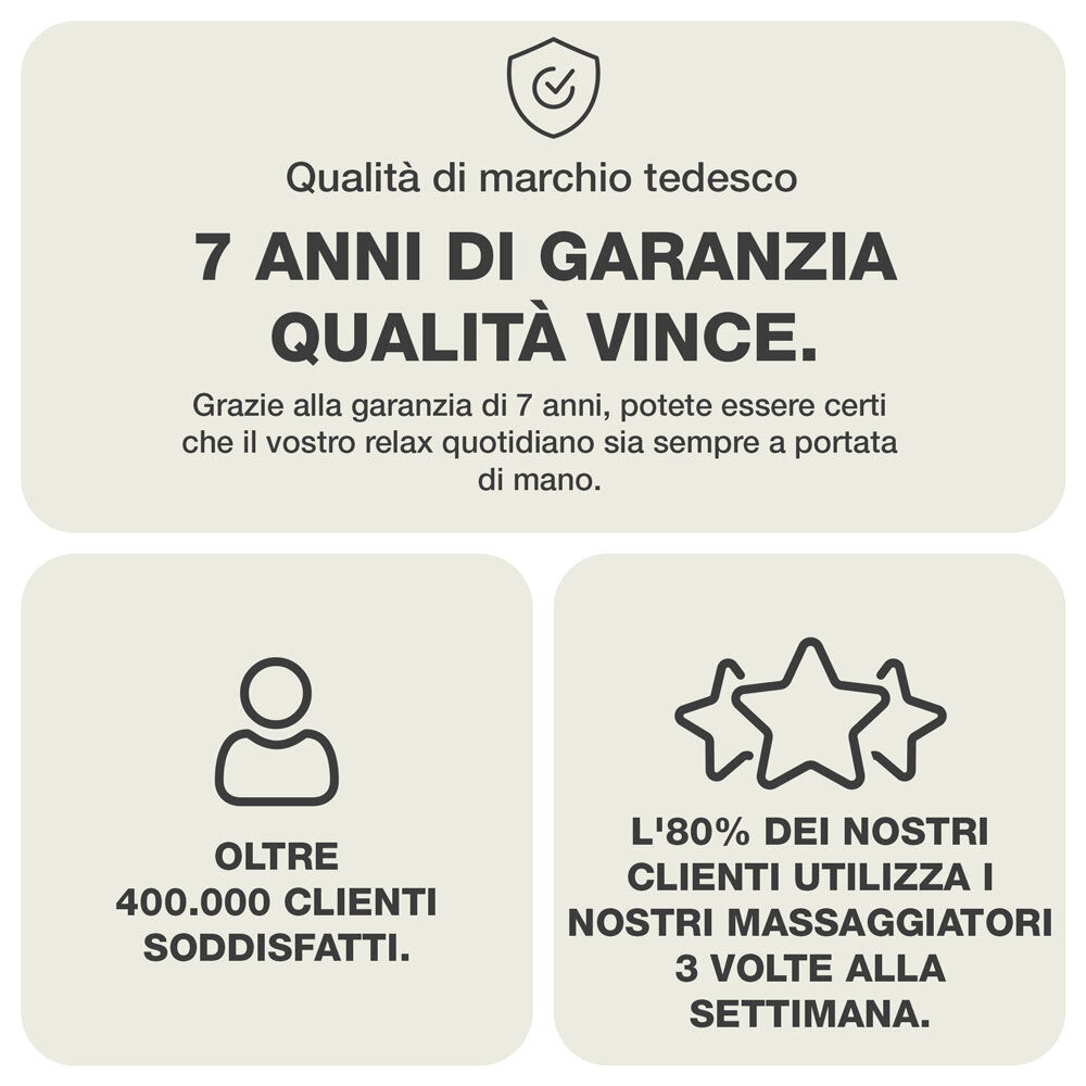 Abbiamo completa fiducia nella qualità del nostro massaggiatore per il collo e per tale motivo offriamo una garanzia di 7 anni. Il potente motore e la garanzia di 7 anni sono sinonimi di qualità!