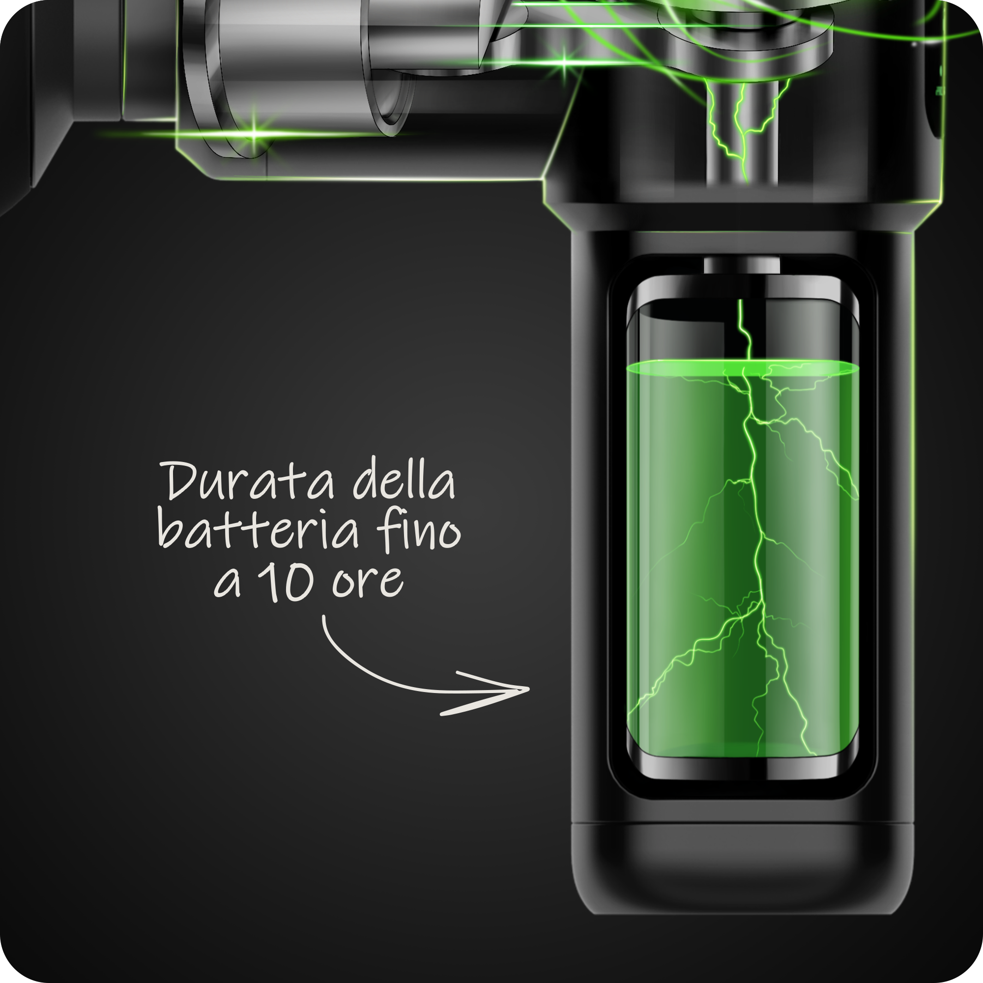 La batteria Samsung integrata nel Miniberg ad alta densità energetica (2600 mAh) offre prestazioni di lunga durata e un'autonomia di circa 800 cicli di ricarica. Il tempo di funzionamento della batteria varia a seconda dell'intensità del massaggio ed è di circa 3-8 ore. In questo modo, la pistola per massaggi può essere utilizzata in viaggio o all'aperto.