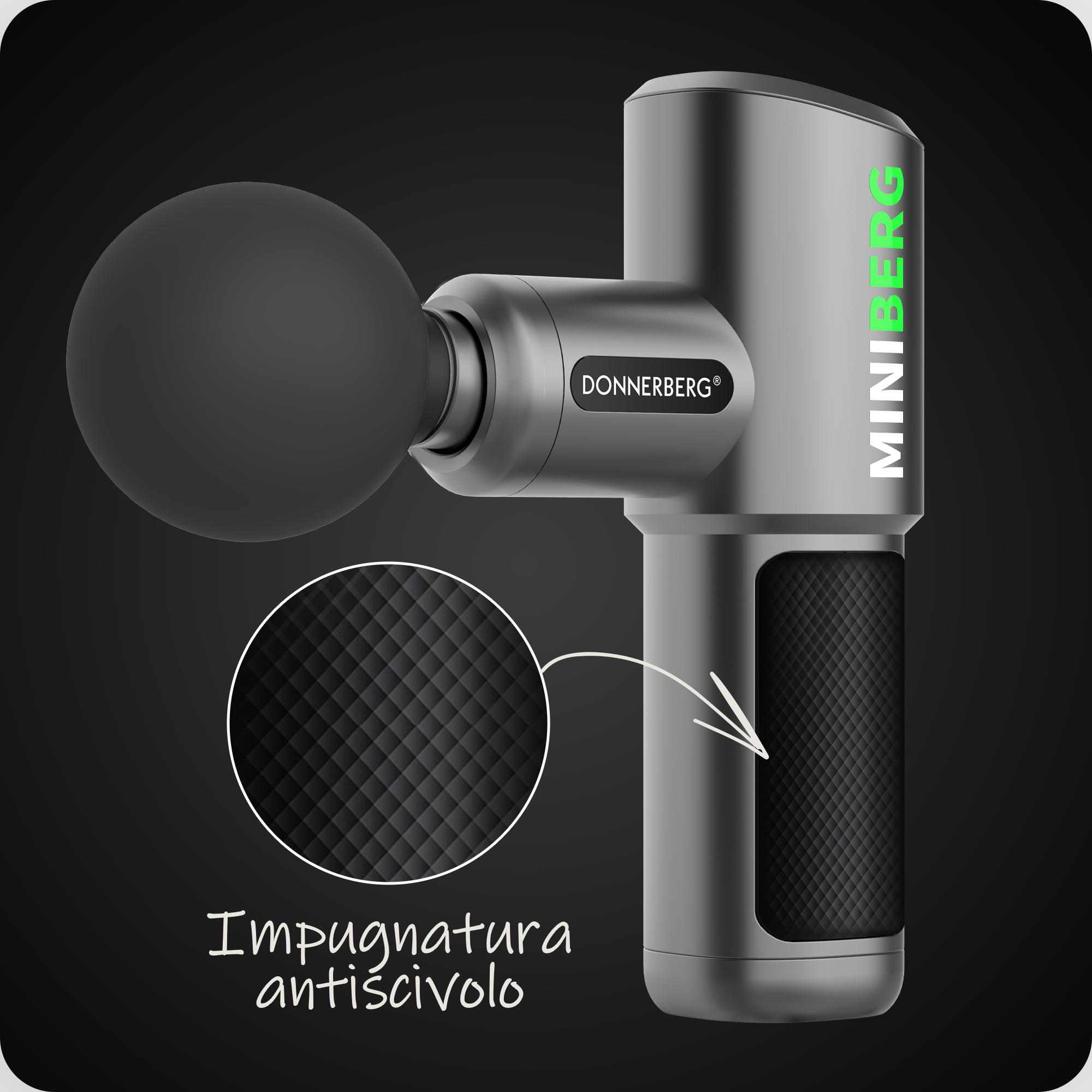 La pistola per massaggio Miniberg è dotata di un robusto alloggiamento in alluminio anodizzato, resistente ai graffi e alla corrosione, che garantisce una protezione duratura della vernice. L'impugnatura ergonomica è antiscivolo e offre non solo una maggiore stabilità, ma anche una presa ottimale durante l'applicazione.