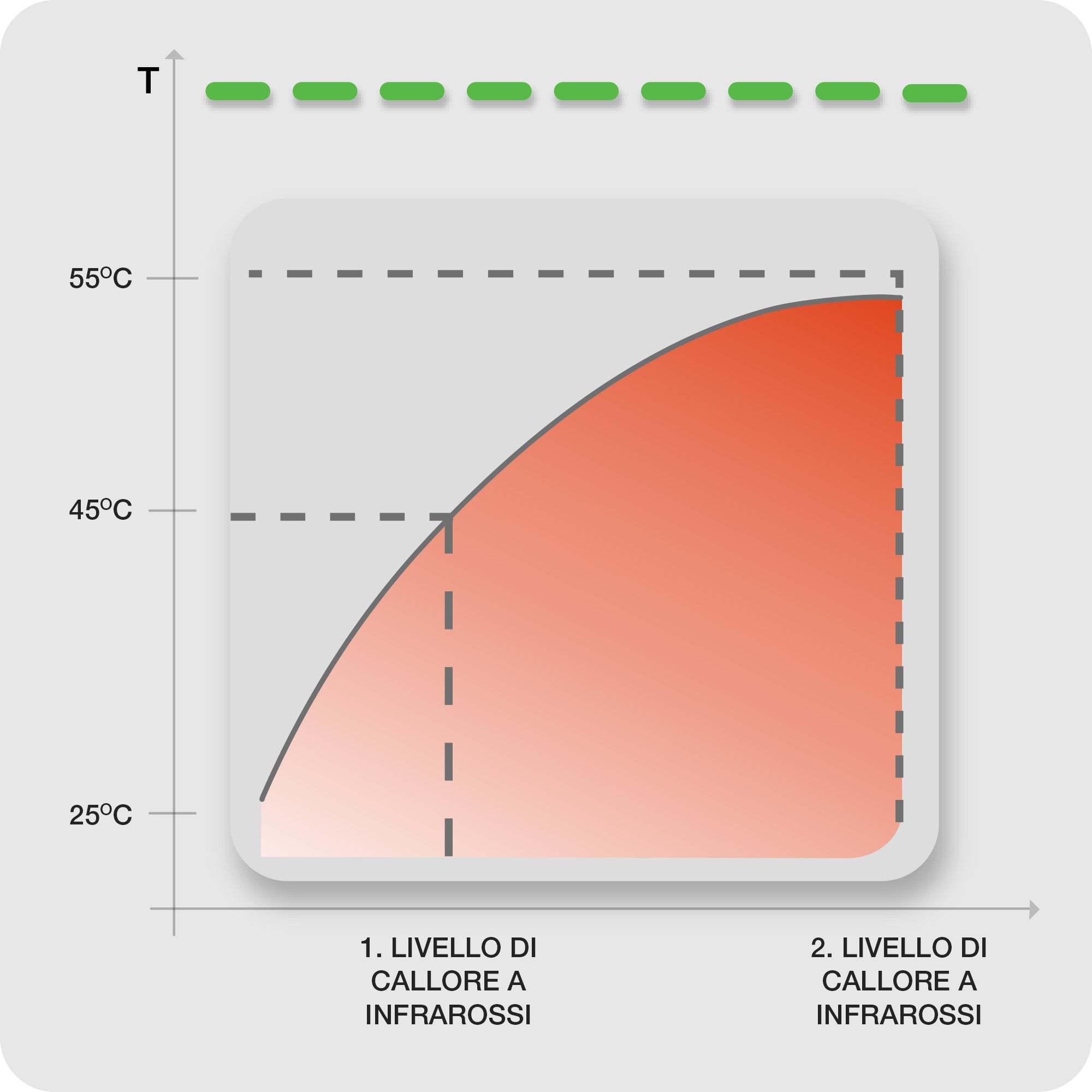 Il calore a infrarossi commutabile in due fasi vi permette di regolare la temperatura ottimale per voi. La protezione integrata contro il surriscaldamento garantisce un utilizzo senza preoccupazioni.
